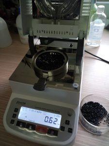 • 測試再生尼龍顆粒:倒出8克左右再生尼龍料顆粒倒在不銹鋼托盤(pán)中,為了使測試過(guò)程中再生尼龍水分儀將再生尼龍料烘干烘透,我們將尼龍顆粒攤成分散狀,以便溫度能滲透進(jìn)再生尼龍內部。用鑷子將再生尼龍顆粒平鋪均勻,為避免尼龍顆粒烘烤后變焦變黑,我們將溫度設置在125℃,按“START”鍵開(kāi)始測試,5分40秒后檢測結束,檢測數據顯示0.67%;