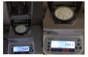 測試樣品:取5克大米,用粉碎機打成粉末狀,置于不銹鋼托盤(pán)中平鋪均勻,溫度設置120℃用儀器進(jìn)行加熱,約12分鐘后檢測結束,檢測數據顯示14.38%;
